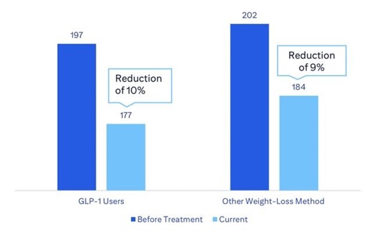 La encuesta del Laboratorio de Innovación de Citi Research muestra que los consumidores de GLP-1 para adelgazar experimentaron una reducción de peso de un 10%, frente a una media del 9% de pérdida de peso de los consumidores que seguían otros regímenes de adelgazamiento.