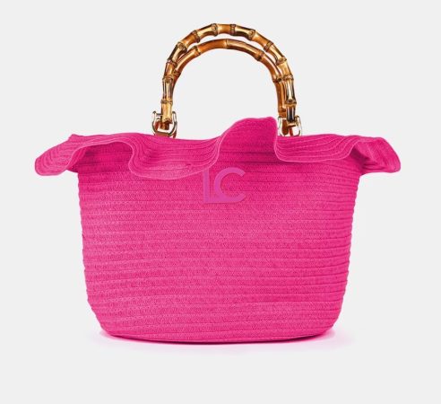 Se trata de un modelo que llega en color fucsia. Es un capazo de rafia con volantes y unas asas rígidas de efecto bambú. Tiene un cierre central con cremallera y un bolsillo lateral interior. El bolso le da un toque de lo más veraniego a nuestro look. Además, este tiene el logo frontal en metal dorado. Si quieres hacerte con este, que sepas que aquí es donde vas a poder encontrarlo.