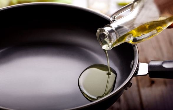Este paso lo podemos hacer antes de pelar y trocear las berenjenas para ahorrarnos unos minutos. Cogemos un sartén de tamaño medio y la ponemos al fuego a temperatura media. A continuación, echamos un chorro generoso de aceite de oliva virgen extra, tiene que ser virgen extra para que dé más sabor a las berenjenas. Antes de echar los trozos de berenjena, vamos a dejar que se caliente durante unos minutos o hasta que veamos que empiezan a salir burbujas del aceite.