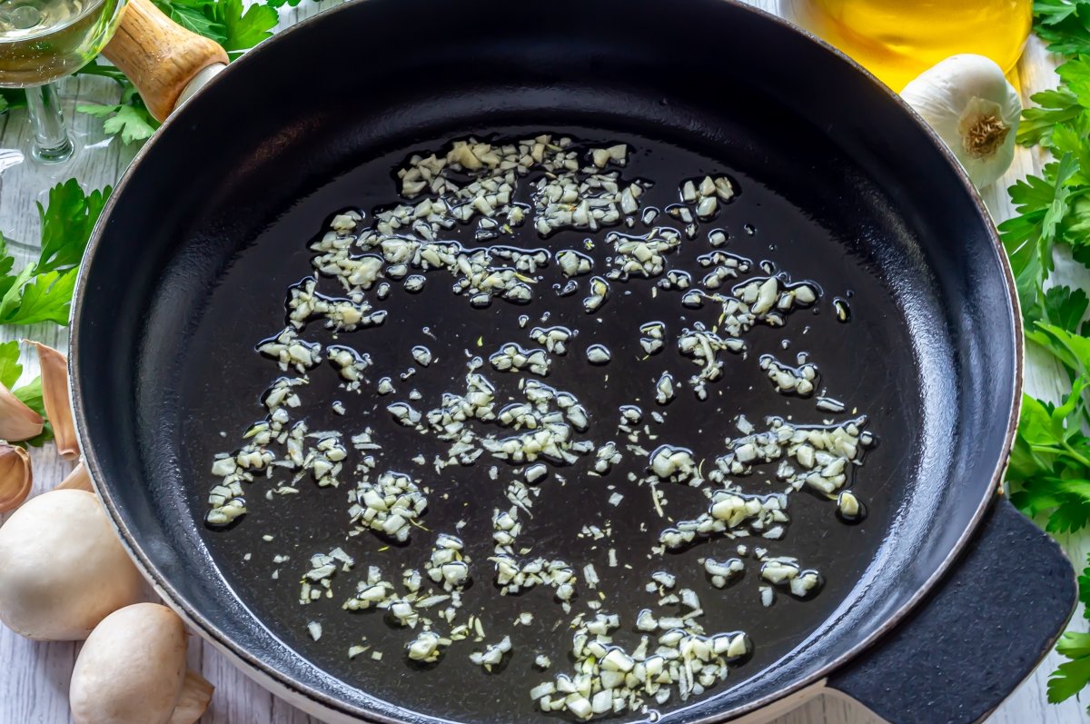 No es añadirlos directamente en la sartén con las berenjenas, sino que vamos a utilizar otra sartén para crear un aceite con sabor a ajo y un toque de guindilla. Cogemos una sartén y la colocamos en el fuego a temperatura media/alta, sin llegar a la máxima potencia. Acto seguido, introducimos las láminas del ajo y comenzamos a freírlos hasta que tengan un doradito exterior que sea agradable a la vista. Antes de que estén bien crujientes los ajos, hay que añadir la guindilla troceada. Si no eres fan del picante puedes retirarle las semillas que es donde está el cápsico, lo que pica de la guindilla.