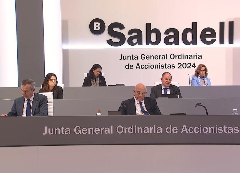 La junta general ordinaria de accionistas de 2024 de Banco Sabadell ha dado luz verde, con la aprobación de todos los puntos del día, a la distribución de un dividendo de 0,03 euros por acción correspondiente al ejercicio 2023 y la reducción de capital social de la entidad por un importe máximo de 340 millones de euros mediante un programa de recompra de acciones para su amortización. Delegados de CC.OO., Alta, Fine, Intersindical y UGT han criticado el aumento de remuneraciones de la alta dirección del banco y que parte de la plantilla tenga el salario congelado por tener complementos absorbibles