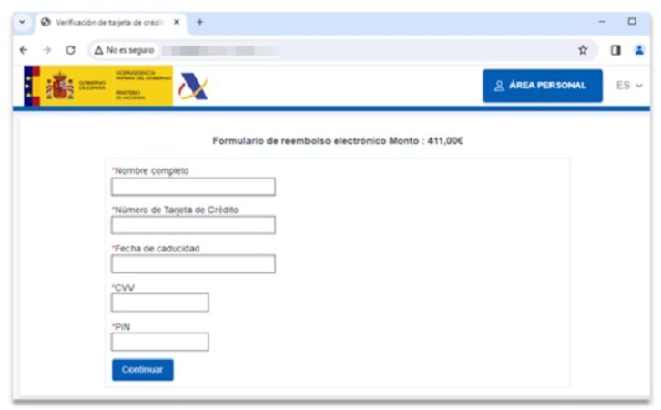 El verdadero peligro es que se rellenen los datos que piden en las casillas de la web a la que redirige el enlace, en la que se pide al usuario que introduzca su nombre completo, número de tarjeta de crédito, fecha de caducidad, CVV y PIN.