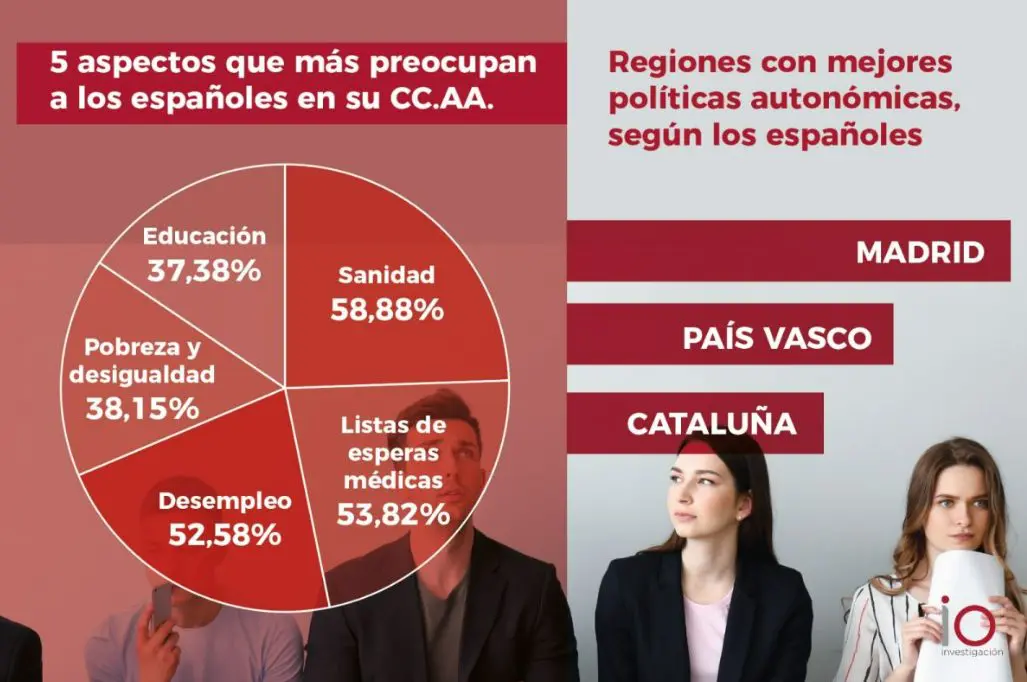 La sanidad es el tema autonómico que más preocupa a los españoles en su respectiva región -concretamente al 58,88%- seguido, a gran distancia, de otros asuntos como las listas de esperas médicas de su comunidad (53,82%), la tasa de desempleo (52,58%), el nivel de pobreza y desigualdad social (38,15%) y la educación (37,38%).