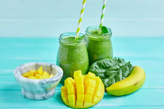 En tu licuadora agrega trozos de mango fresco, un banano cortado en pedazos y varias hojas de espinaca. Luego opta por agregar leche, agua o jugo de naranja, depende tu preferencia y un par de cubos de hielo. Mezcla por unos minutos y si quieres, al final, puedes agregar unas semillas de chía o lino que le proporcionarán excelentes propiedades a tu cuerpo y le darán un toque crocante a tu zumo.