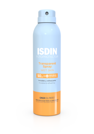 Isdin Transparent Spray Wet Skin es el fotoprotector corporal en spray invisible y ligero para piel mojada. Se caracteriza principalmente por su textura en spray transparente, fresco y de secado inmediato y se trata del protector solar corporal de referencia y líder en la categoría de sprays del mercado español. Gracias a su exclusiva tecnología ‘wet skin’ se puede aplicar incluso sobre piel mojada, manteniendo el factor de protección y la eficacia protectora del producto sin dejar residuo blanco y consiguiendo una absorción y secado inmediatos.