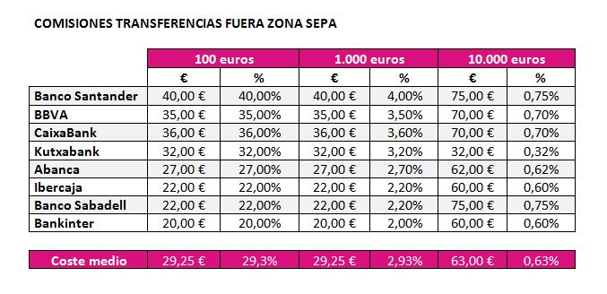 Banco Santander es el que más cobra por una transferencia de este tipo , según Asufin, 40 euros ñpor 100 enviados, pone como ejemplo. Le sigue BBVA con 35 euros, mientras que en la tercera posición está Caixabank con 36 euros. En la parte baja, Ibercaja cobra 22 euros, lo mismo qu Banco Sabadell. Bankinter es el más ‘barato’ a la hora de cobrar por operación de transferencia fuera de SEPA. La entidad que preside María Dolores Dancausa cobra 20 euros. El coste medio es de casi 30 euros.