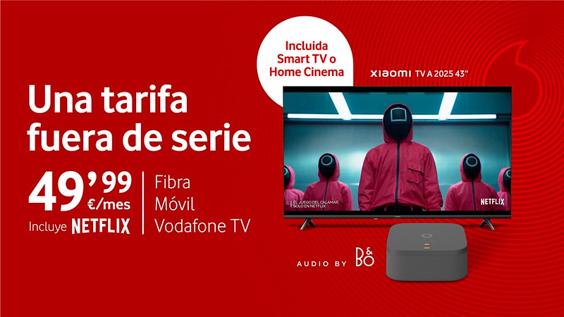 El paquete incluye Vodafone TV con el Plan Estándar con anuncios de Netflix y podrán elegir entre el decodificador 4K Pro para una experiencia de Home Cinema, o una Xiaomi TV A de 43 pulgadas, si realizan la portabilidad desde otro operador.