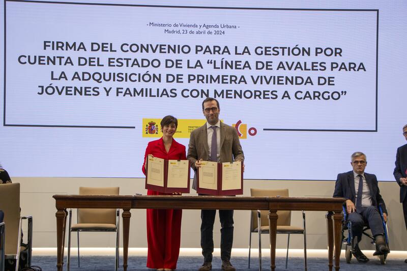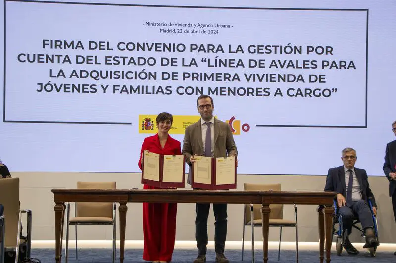 La ministra de Vivienda y Agenda Urbana, Isabel Rodríguez, y el ministro de Economía, Comercio y Empresa, Carlos Cuerpo, han presidido el acto de formalización del convenio que regula la gestión de la línea de avales del 20% para la adquisición de la primera vivienda de jóvenes menores de 35 años y familias con menores a cargo, por lo que las entidades financieras ya pueden adherirse a la misma.