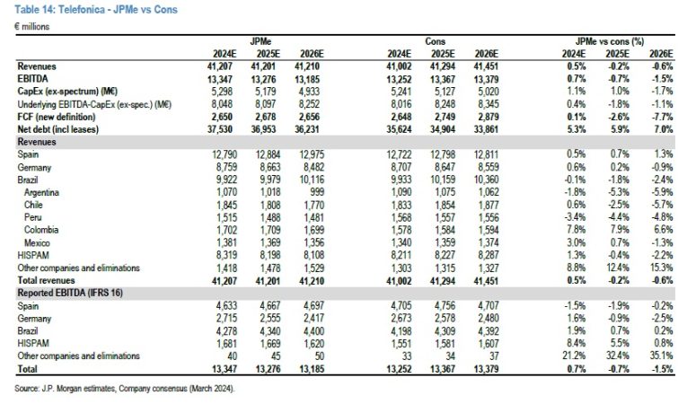El informe de JP Morgan valora al alza la compañía, y augura que durante este año Telefónica alcanzará el valor de 41.207 millones de euros, cuando la previsión era de 41.025 millones de euros, y lo mejora más bastante más para 2025, en que se preveía un valor de la compañía de 40.845 millones de euros, y ahora prevé que alcance los 41.201 millones. Las cifras toman mayor relevancia cuando se comparan con el valor de 23.430 millones de euros que presentaba el grupo en bolsa este lunes.