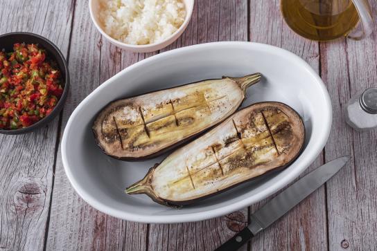 Envuelve cada verdura individualmente en papel film de cocina y colócalas en el microondas. Cocina las berenjenas a máxima potencia (generalmente alrededor de 800W) durante aproximadamente ocho minutos. El tiempo puede variar según el tamaño de las hortalizas y la potencia de tu microondas. Estará lista cuando esté tierna al pincharla con un tenedor. Deja que se enfríen completamente antes de quitarles el papel film.