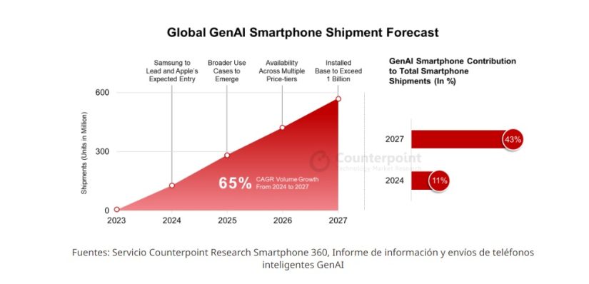 Según el informe «GenAI Smartphone Shipments and Insights» elaborado por la consultora especializada Counterpoint Research, que eleva las estimaciones respecto a las previstas en diciembre de 2023, cuando Samsung no había presentado todavía su S24, la introducción de la IA generativa aumentará las ventas de los smartphones el 11% en 2024 y se cuatriplicará hasta llegar al 43% en 2027, cuando se prevé que supere los 550 millones de unidades, y el informe apunta a que la IA esté instalada ya en mil millones de móviles para ese año.