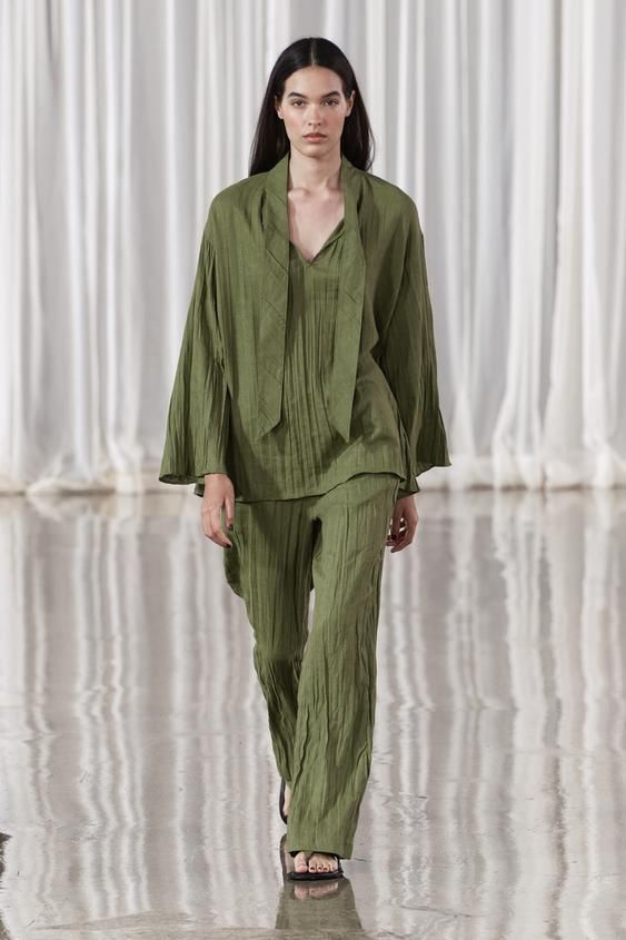 Los pantalones pijameros de lino arrugado de la colección ZW de Zara son la opción perfecta para combinar comodidad y estilo en tus looks de verano. Confeccionados en una hilatura de lino, estos pantalones ofrecen una sensación fresca y ligera, ideal para los días cálidos de la temporada. Su tiro medio y cintura elástica garantizan un ajuste cómodo y favorecedor, mientras que los bolsillos en el delantero añaden un toque práctico y funcional a su diseño.