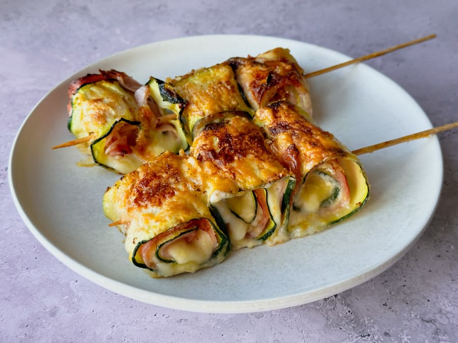 Después, se enrollan las láminas alrededor del jamón y el queso formando un rollo y se ensartan en un pincho de madera. Una vez que formaste cuatro de estos rollos en cada pincho, sumérgelos en huevo batido y se recubren con harina de almendra. Para finalizar, pon estas brochetas en una freidora de aire o en el horno convencional durante 15 minutos a 180-200° grados con calor arriba y abajo. Así tendrás una comida rica y nutritiva hecha con calabacín y en menos de 20 minutos.