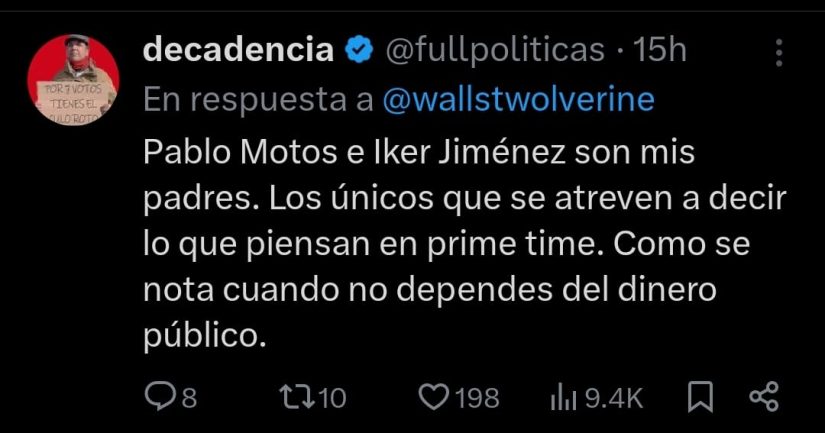 Luego, expresó: “Sin oposición no hay democracia. Una democracia sin alternancia de poder no es democracia. Un partido no es democrático si no se somete a las críticas de su propio partido y de los demás. Y hasta ahora todos estábamos muy tranquilos con la democracia. La democracia es como el Wi-Fi, que mientras está todo el mundo lo da por sentado, pero si se va, se va todo a la porra. ¿Estamos jugando con la democracia? ¿Este es el juego? ¿Lo que se pone encima de la mesa es la democracia y unos señores que hay que eliminar?”, dijo el presentador.
