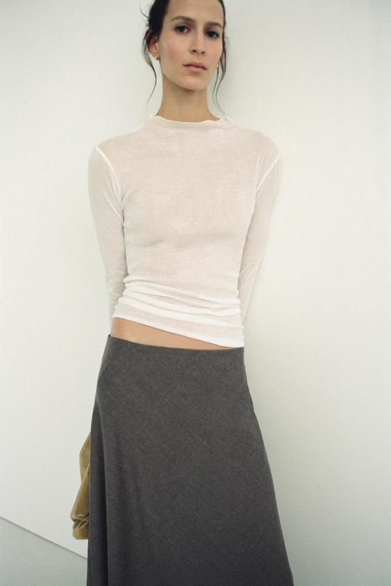 Zara ofrece su elegante camiseta semitransparente de algodón crepe por tan solo 12,95 EUR. Esta prenda, confeccionada en crepe de algodón 100%, presenta un diseño ligero y ajustado, ideal para lucir durante las temporadas más cálidas. Con cuello perkins y manga larga, esta camiseta ofrece un equilibrio perfecto entre estilo y comodidad.