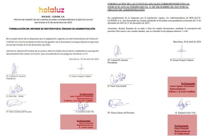 La tercera anomalía de las cuentas de HolaLuz, la empresa que creyó ser la Tesla española de la mano de Carlota Pi, es la falta de firmas de Axon Capital e Inversiones y de Geroa Pensioak, representados por Alfonso J. de León y Jordan Saenz, respectivamente.
