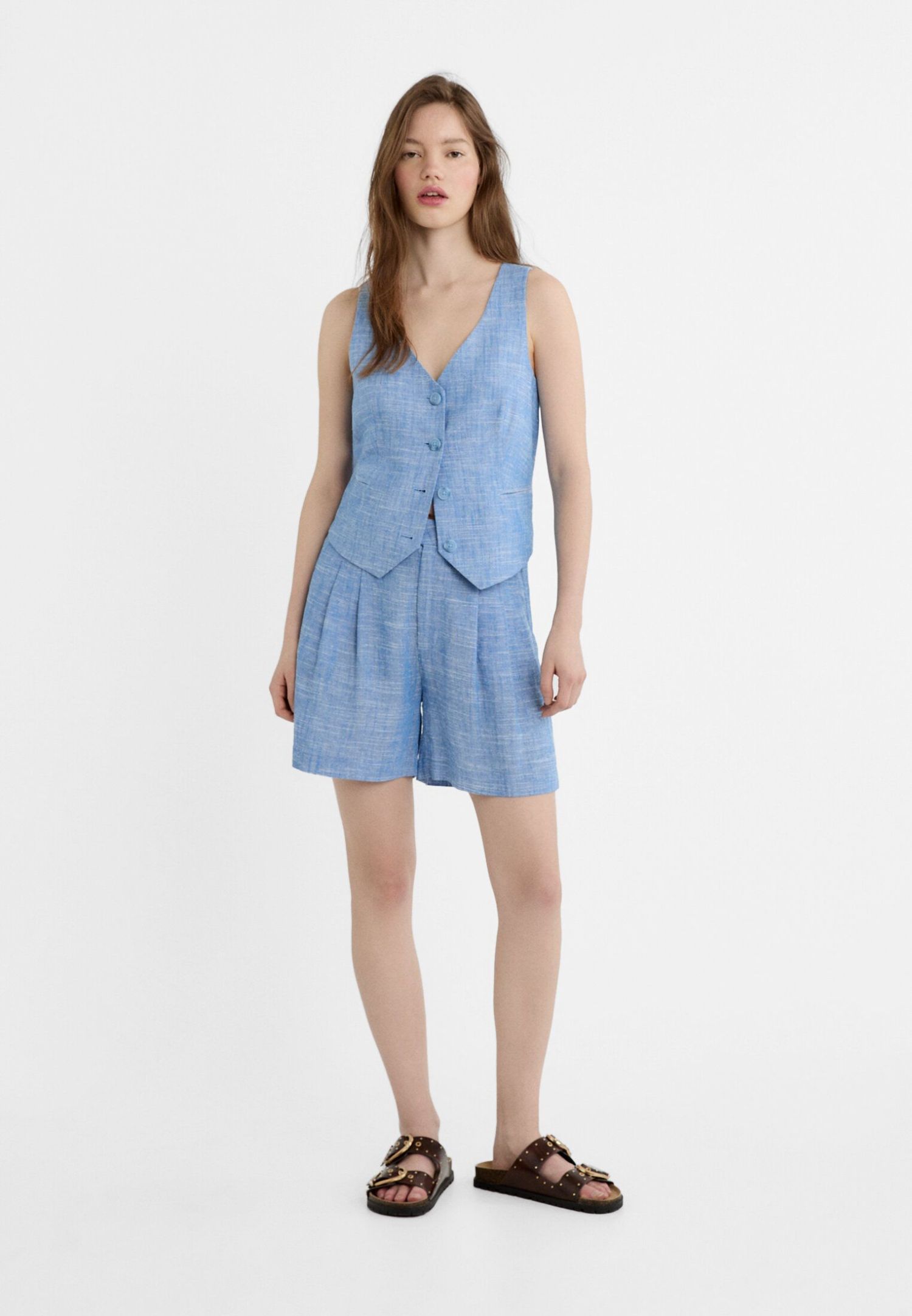 Complementando este chaleco, Stradivarius presenta su Bermuda Fluida con Pliegues y Lino, una opción cómoda y chic para lucir con estilo durante la temporada de verano. Esta bermuda de tiro medio, confeccionada en mezcla de lino, destaca por su cintura elástica con trabillas y sus bolsillos laterales, que ofrecen funcionalidad sin sacrificar estilo. El detalle de pliegues en el delantero agrega un toque de sofisticación adicional, mientras que el cierre frontal cruzado con cremallera y botón garantiza un ajuste seguro y cómodo.
