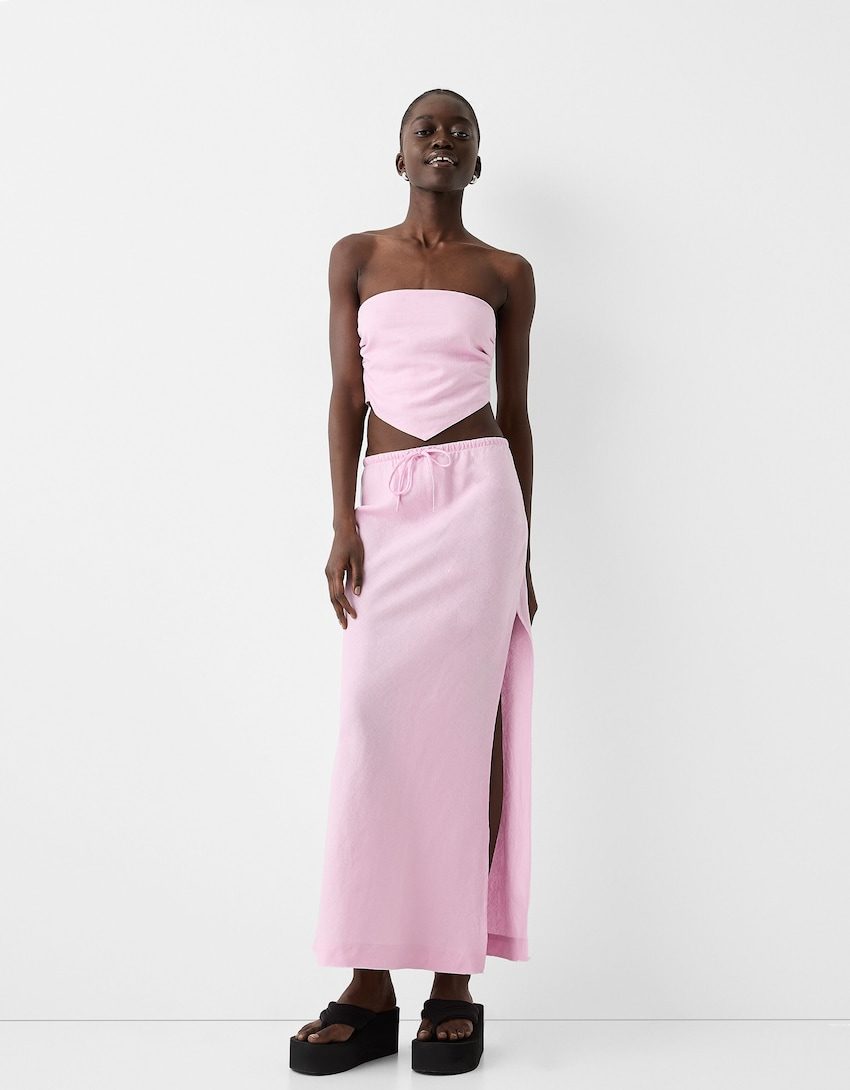 La versatilidad de esta falda midi permite una amplia gama de combinaciones, desde un look casual para el día a día hasta una opción más elegante para eventos especiales. Su diseño atemporal y su cuidadosa confección aseguran que se convierta en una pieza clave en tu armario, lista para acompañarte en todas tus aventuras durante el entretiempo. Aprovecha esta oportunidad de adquirir una prenda versátil y de calidad a un precio inigualable, y añade un toque de frescura y estilo a tu colección de verano con Bershka.
