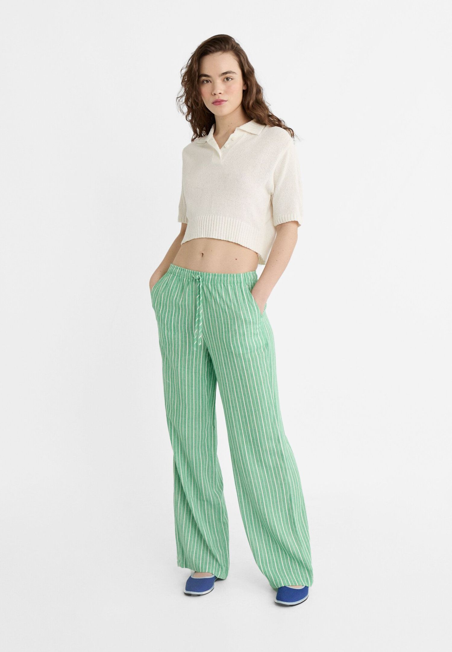 Descubre la comodidad y el estilo del pantalón fluido con lino de rayas de Stradivarius. Este versátil pantalón largo está confeccionado con una mezcla de lino que le confiere una textura ligera y fresca, perfecta para los días más cálidos de la temporada. Su pernera ancha proporciona una sensación de libertad y fluidez al caminar, mientras que los detalles de bolsillos en los laterales añaden un toque práctico y funcional a la prenda.
