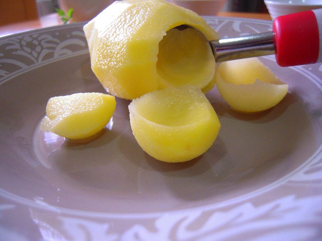 Ahora, corta las papas por la mitad de manera horizontal para tener dos partes iguales. Con una cucharilla de postre, haz un pequeño hueco en el centro de cada mitad. Esto creará un espacio perfecto para rellenarlas más tarde con el delicioso atún.