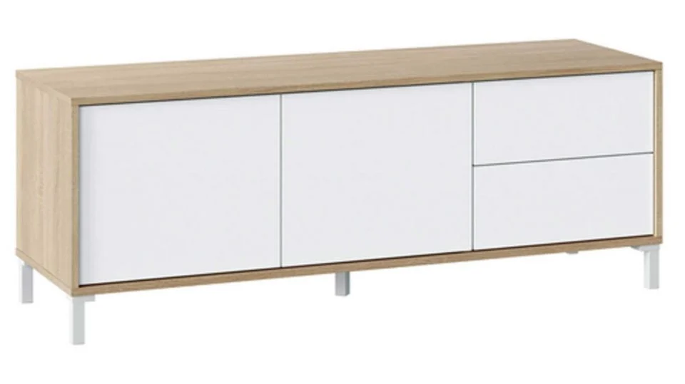 El diseño del Fores combina un acabado en color roble con toques en blanco, creando un contraste que es tanto moderno como elegante. Sus dimensiones compactas lo hacen perfecto para adaptarse a espacios pequeños, mientras que sus dos puertas y dos cajones deslizantes ofrecen un amplio espacio de almacenamiento para dispositivos electrónicos, juegos y otros accesorios.