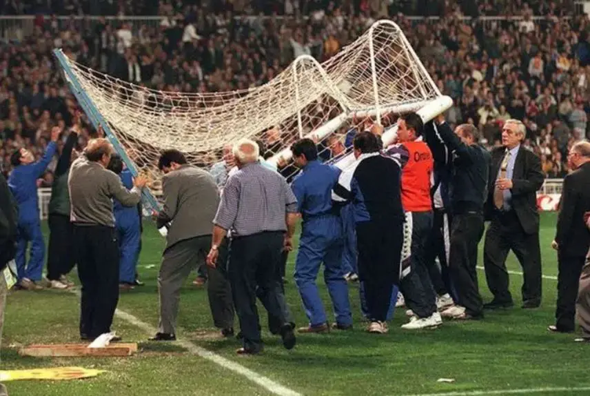 El Santiago Bernabéu, el estadio del Real Madrid, ha vivido muchas cosas. Una de las más lamentables sucedió el 1 de abril de 1998. Los blancos recibían al Borussia Dortmund en la ida de la semifinal de la Champions y minutos antes de que comenza el partido, los ultras apostados en la red protectora, derribaron la portería, que incompresiblemente estaba anclada a la misma. Esto provocó que el choque se retrasara muchísimo una hora y cuarto. El choque se jugó gracias a que el Madrid encontró una portería de recambio en la antigua Ciudad Deportiva del club. Una portería que parecía de juguete, pero que pasó la prueba de las medidas reglamentarias.