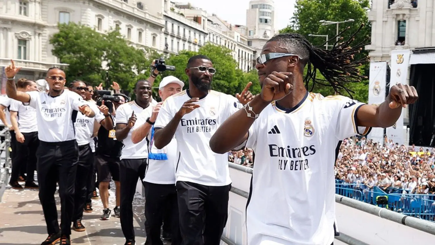 Eduardo Camavinga y los futbolistas del Real Madrid se encuentran en medio de un ambiente festivo. La plantilla del conjunto merengue salió a las calles de la capital española este domingo para festejar el título número 36 de la Liga de España y, como es habitual, se dirigieron a la fuente de Cibeles para cumplir con la tradición.