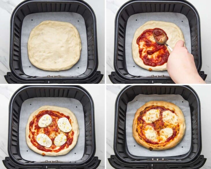 Si decides utilizar una masa fresca, es importante hacer una cocción en blanco primero. Comienza por precalentar la freidora de aire a 200 ℃ durante aproximadamente 5 minutos. Esto asegurará que esté bien caliente cuando coloques la masa. Mientras la freidora se calienta, espolvorea una lámina de papel para freidora de aire con una cucharada de sémola de trigo duro. La sémola ayudará a que la masa no se pegue y también le dará una textura crujiente en la base.