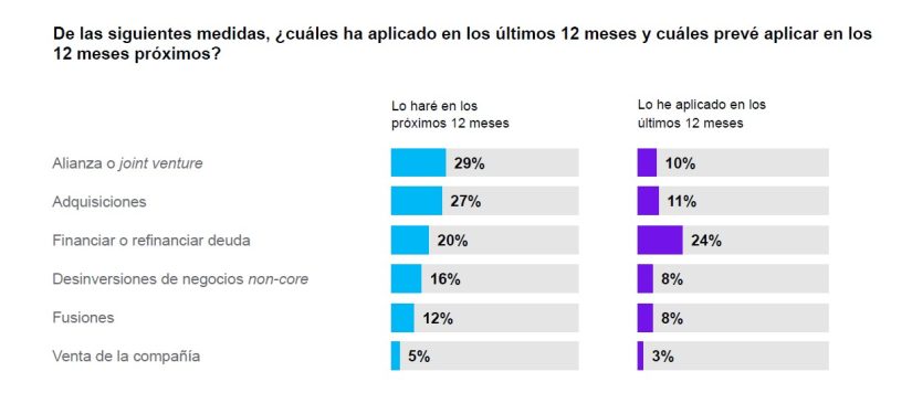 La financiación y refinanciación de deuda se coloca en tercera posición en cuanto a las medidas que prevén llevar a cabo las empresas durante este 2024. Además, es la medida que más se ha realizado en los últimos 12 meses (24% de los encuestados) lo que no es de extrañar dada la reactivación de los mercados de crédito, a pesar de que la financiación sigue siendo cara. Por el momento, ese mayor coste de capital y el contexto geopolítico incierto hacen que sea más complicado cerrar megadeals.