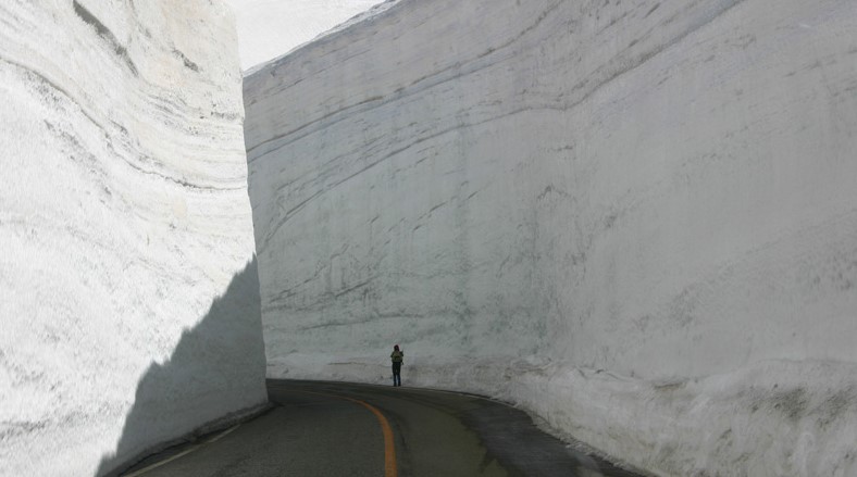 La famosa carretera en la región montañosa que se extiende al oeste de Nagano es limpiada por una ingente cantidad de excavadoras, trabajan de manera incansable para que las altas paredes de nieve que se forman en los costados de la ruta no se derrumben, pues sepultaría a coches y autobuses.