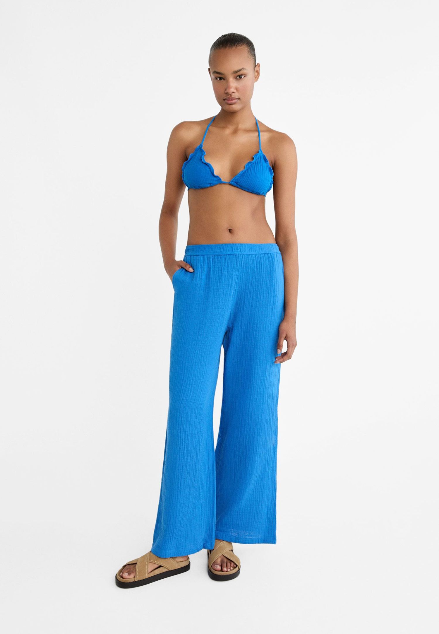 Complementando este pantalón, encontramos el Top Bikini Triángulo de Cortinilla, una opción encantadora para lucir en la playa o la piscina. Con un precio tentador de 15,99 €, este top de bikini en forma de triángulo corredero destaca por su relleno extraíble y sin aros para un efecto natural, así como por su detalle de acabados con volantes que añaden un toque femenino y coqueto.