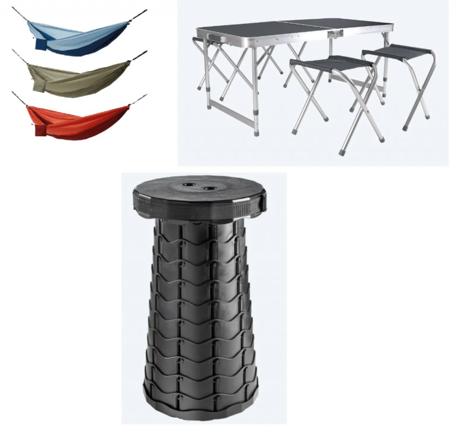 Y no podemos olvidar el set de mesa y taburetes de aluminio por 19,99 euros. Este conjunto ingeniosamente diseñado incluye una mesa y cuatro taburetes que se pliegan y se guardan dentro de la mesa, facilitando enormemente su transporte. Fabricado con aluminio de alta calidad, este set combina estabilidad y ligereza, asegurando que tus comidas al aire libre sean cómodas y sin complicaciones.