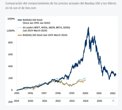 desde JP Morgan son tajantes: No porque los precios de las acciones de la IA están «lejos de los máximos de la burbuja tecnológica que se produjo entonces»