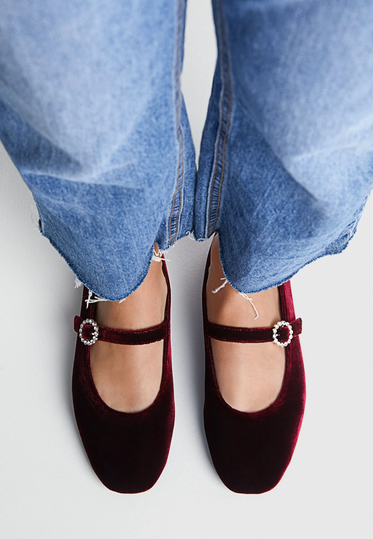Las bailarinas planas de terciopelo de Stradivarius son una elección elegante y confortable para cualquier ocasión. Disponibles en una paleta de colores que incluye un rico burgundy y un clásico negro, estas bailarinas destacan por su exquisito material de terciopelo que añade un toque de lujo a tu look. Con un detalle de tirador en la parte trasera y un cierre mediante hebilla con joyas, estos zapatos combinan estilo y funcionalidad a la perfección. Además, con una altura de piso de 2 cm, proporcionan estabilidad y comodidad para caminar durante todo el día.