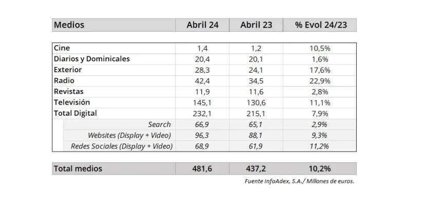 Durante el mes de abril de 2024, la inversión publicitaria ha alcanzado los 481,6 millones de euros, creciendo un 10,2% respecto al periodo equivalente del año anterior cuando el volumen registrado fue de 437,2 millones, y favorece a Atresmedia, según los últimos datos publicados por Infoadex.
