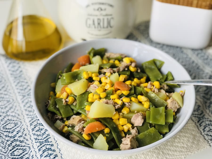 Las judías son una elección perfecta para ensaladas, y esta ensalada de judías verdes con atún es especialmente refrescante, ideal para el verano. Además del atún, lleva huevos de codorniz, tomates, cebolleta, zumo de limón, aceite de oliva virgen extra, albahaca y sal.