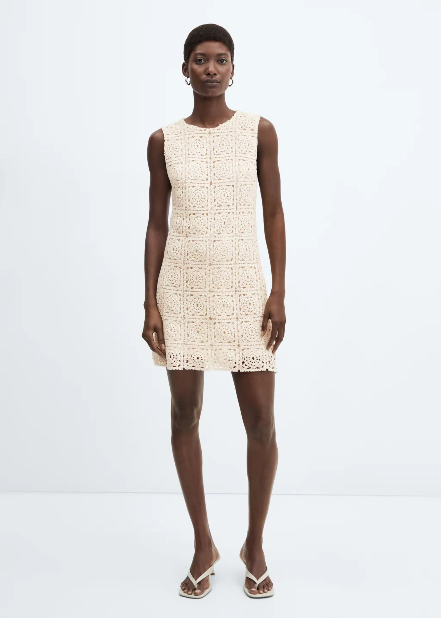 Descubre la elegancia natural del vestido de crochet de algodón de Mango, una opción refinada y versátil para cualquier ocasión. Confeccionado con un exquisito tejido de mezcla de algodón y bordado, este diseño corto presenta un corte recto y un cuello redondo que realza la feminidad con tirantes anchos y sin mangas. El detalle del cierre de botón en la parte posterior añade un toque de sofisticación a esta pieza atemporal.