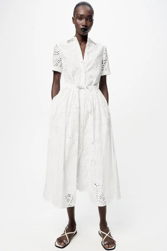 El Vestido Camisero Bordados de la ZW Collection de Zara Woman ofrece una opción sofisticada y elegante para lucir en cualquier ocasión. Confeccionado en hilatura de algodón 100%, este vestido midi garantiza comodidad y frescura durante su uso. Presenta un cuello solapa y manga corta, añadiendo un toque de estilo clásico y versátil.