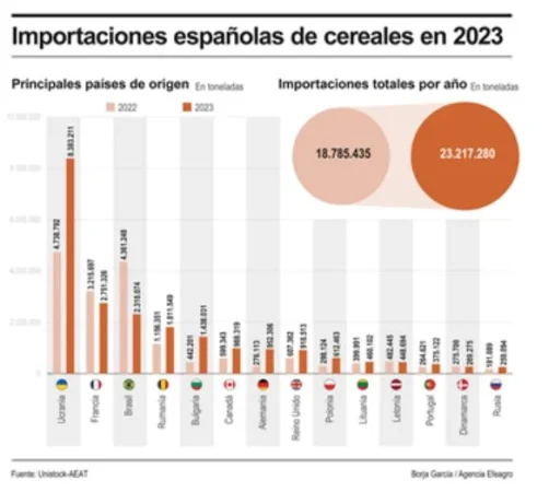 Por otro lado, la situación del cereal y de la acumulación por parte de los productores de stock esperando un comprador, se contrasta con el incremento de importación en los últimos años. Únicamente el incremento de 2022 a 2023 supone un 23,6% hasta alcanzar los 23 millones de toneladas en cuanto a importaciones.