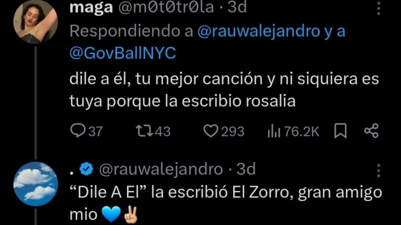 Ante esa pregunta y las cientos de respuestas que arrojaron los fans del cantante portorriqueño, uno de ellos se destacó entre tantos. Una usuaria que es fiel seguidora de Rosalía, ya que tiene una foto de la española como perfil, le escribió: “Dile a él”, tu mejor canción y ni siquiera es tuya porque la escribió Rosalía”. Por suerte tranquilita la fan de Rosalía.