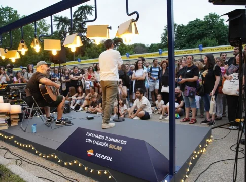 La directora de la feria, Eva Orúe, inauguró la noche y presentó el concierto sorpresa de Rayden, que reunió a un gran número de personas en el parque de El Retiro donde el artista interpretó algunos de sus grandes éxitos. Además del cantante madrileño, que anunció el pasado año su retirada de los escenarios en 2024, ‘La noche iluminada’ reunió actuaciones sorpresa de otros artistas emergentes como Natalia Vega, El no de las niñas o Álvaro Sola, de la compañía de experiencias musicales inmersivas Sofar Sounds, así como actuaciones de microteatro de los alumnos de la Real Escuela Superior de Arte Dramático de Madrid (Resad).