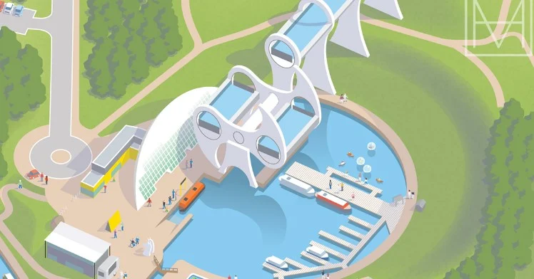 Se trata del único elevador de barcos giratorio del mundo. Una maravilla de la ingeniería que se sitúa en el destino emblemático de los canales escoceses, la Rueda de Falkirk conecta el Canal Forth & Clyde con el Canal Union en media vuelta que lleva solo cinco minutos.