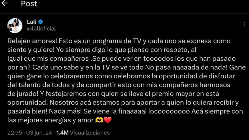 Claro que esto tuvo gran repercusión en las redes sociales, por eso, Lali Espósito salió a defenderse o mejor dicho aclarar la situación. «¡Relajen amores! Esto es un programa de TV y cada uno se expresa como siente y quiere. Yo siempre digo lo que pienso con respeto, al Igual que mis compañeros. Se puede ver en todos los que han pasado por ahí. Cada uno sabe y en la TV se ve todo, no pasa nada de nada», expresó la argentina en “X”, donde no lo tomó a personal y al mismo tiempo, aclaró que todo queda dentro del show televisivo.