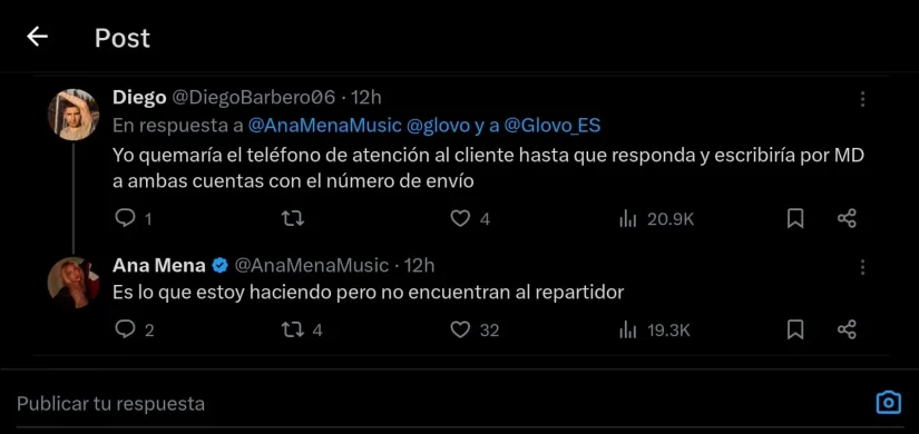 A los pocos minutos de dejar ese comunicado en “X”, exTwitter, Ana Mena comenzó a recibir respuestas. Algunas de ellas cómo: “¿Has probado pulsar el botón de “ayuda” y pulsar que tienes un problema con un pedido? A mí alguna vez me ha ayudado ahí!”, “No es más fácil reclamar, que te vuelven el dinero y pedido otra vez? ¿O eran productos especiales?”, “Yo quemaría el teléfono de atención al cliente hasta que me respondan y escribiría al MD a ambas cuentas con el número de envío”, entre otros.