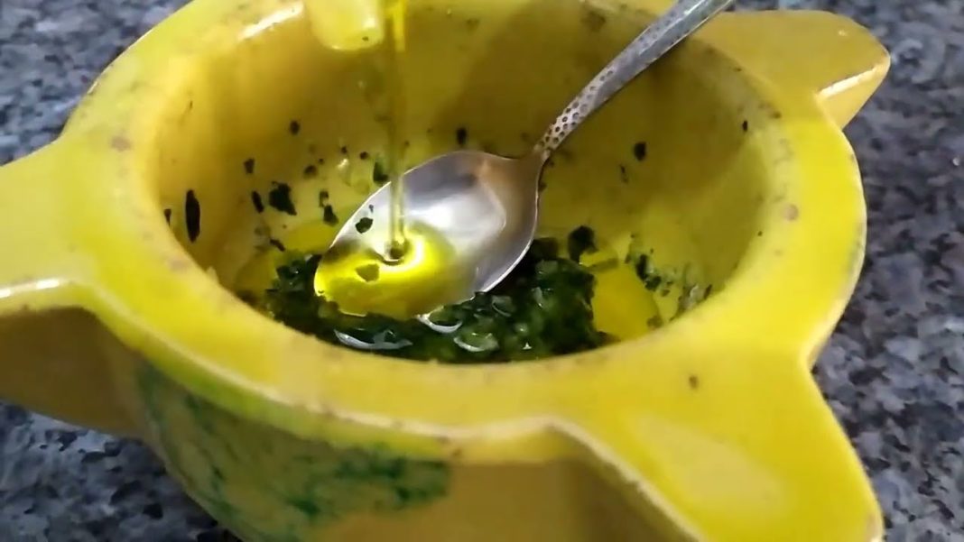 Corta la rebanada de pan en dados pequeños y agrégala también a la sartén. Cocina todos estos ingredientes hasta que estén ligeramente dorados, lo que resaltará los sabores. Una vez dorados, retira la mezcla de la sartén y colócala en un mortero. Añade una pizca de sal gruesa y machaca todos los ingredientes hasta obtener una pasta suave. Añade el azafrán molido y un poco de agua para formar una mezcla más líquida y homogénea. Esto será nuestro majado, lleno de sabor.