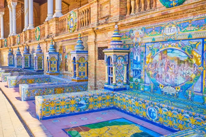 Sus bancos representan a las provincias españolas: Un dato curioso e interesante acerca de esta conocida plaza es que cuenta con bancos que representan a las provincias de España. Sin embargo, existe un error, ya que en total hay 48 bancos cuando el número correcto de provincias españolas son 50. No obstante, existe una razón para ello y es que cuando se comenzó con la construcción de la Plaza de España, las Islas Canarias conformaban una sola provincia. Por otro lado, cabe destacar que Sevilla no se encuentra representada junto al resto de provincias, ya que ya está presente en los otros cuatro murales del propio monumento; y que las provincias están en orden alfabético, excepto una, Navarra.