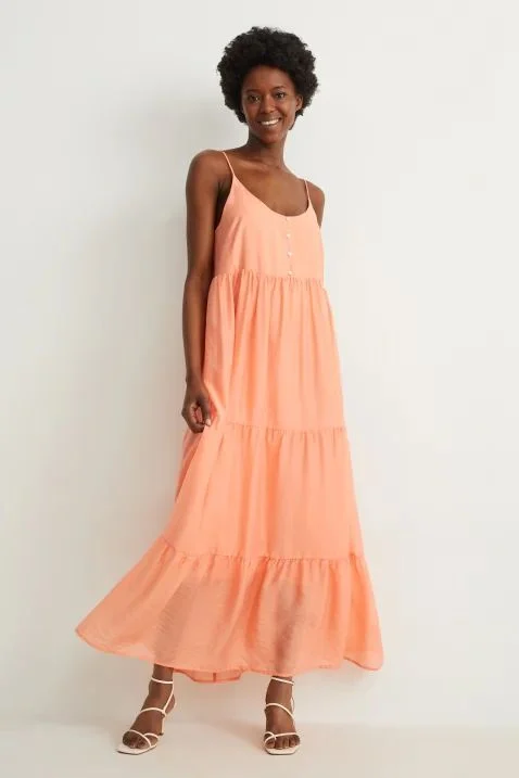 C&A ofrece un vestido de línea evasé a un precio de 48,99 €, destacándose por su excelente relación calidad-precio. Esta prenda está confeccionada en un tejido ligero, perfecto para los días de entretiempo que nos preparan para el verano. Con detalles como botones de adorno en la parte delantera y tirantes finos con acordonado variable en la espalda, este vestido no solo es elegante sino también versátil. El forro fino proporciona un acabado de alta calidad, mientras que sus medidas, con un largo de espalda de aproximadamente 140 cm y un contorno de cintura de 84 cm en la talla 38, aseguran un ajuste cómodo y favorecedor.