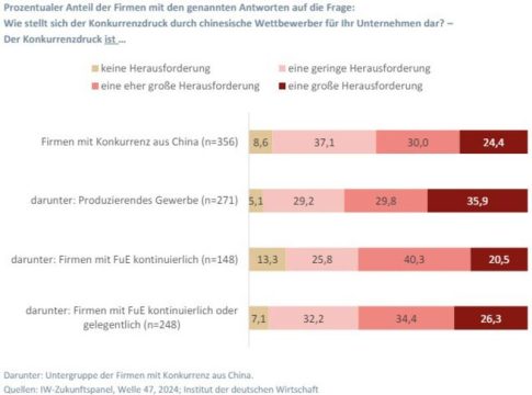 El 63% de las compañías alemanas encuestadas dicen sentir una «fuerte presión» competitiva de China y consideran que no compiten en igualdad de condiciones. La competencia china ha llevado a muchas empresas a perder clientes y a una caída de los beneficios. Entre el 60% y el 95% de las encuestadas ven complicado volver a obtener las cifras de negocio de años pasados. Esto ha llevado a una serie de medidas dramáticas, como recortar la producción, despidos y deslocalizaciones para seguir adelante.