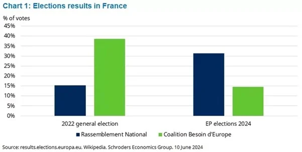 Los primeros indicios apuntan a que la Agrupación Nacional (Rassemblement National o RN por sus siglas en francés) obtuvo la mayor proporción de votos y escaños asignados en el Parlamento Europeo. Esto coincide con el cambio general en toda Europa hacia los partidos nacionalistas populistas de derechas (véanse los comentarios más abajo). Cabe destacar que la RN obtuvo aproximadamente el doble de votos que la coalición gobernante Besoin d’Europe (Necesidad de Europa).