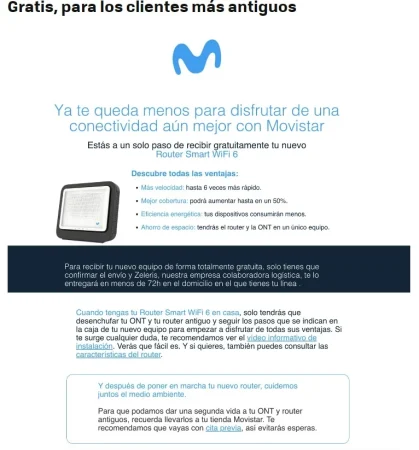 Hay que tener en cuenta que Movistar solo instala el router WiFi 6 a los clientes que ha elegido para probarlo (aseguraban el pasado mes de enero que lo iban a probar gratis los usuarios más antiguos) y si se llama a la compañía y se pide específicamente, se pueden conseguir, por supuesto, pero para nada gratuitos. Hay que acceder a la web de Movistar o llamar a 1004, y tener en cuenta que cuesta 50 euros si se lo instala uno mismo, y 100 si se requiere un técnico para la instalación.
